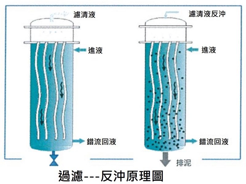 過濾一段時間後,濾清液反流自內而外沖洗膜,使少量附著於表面的污泥脫離膜表面